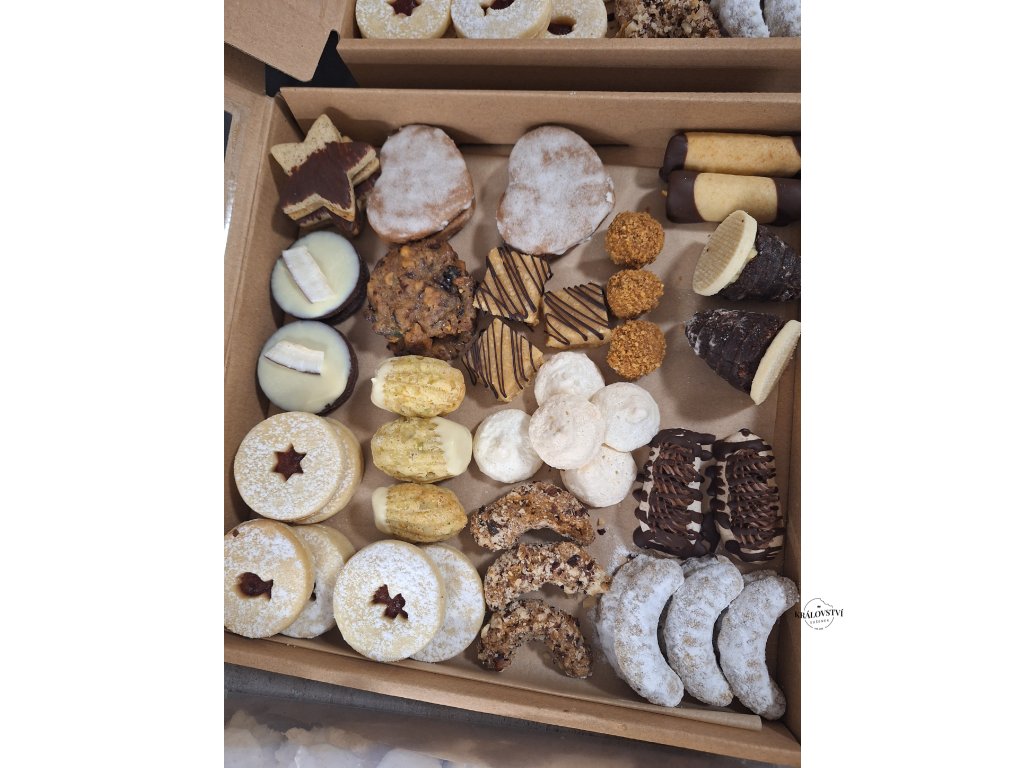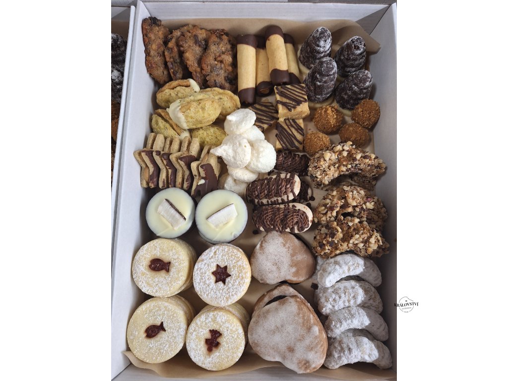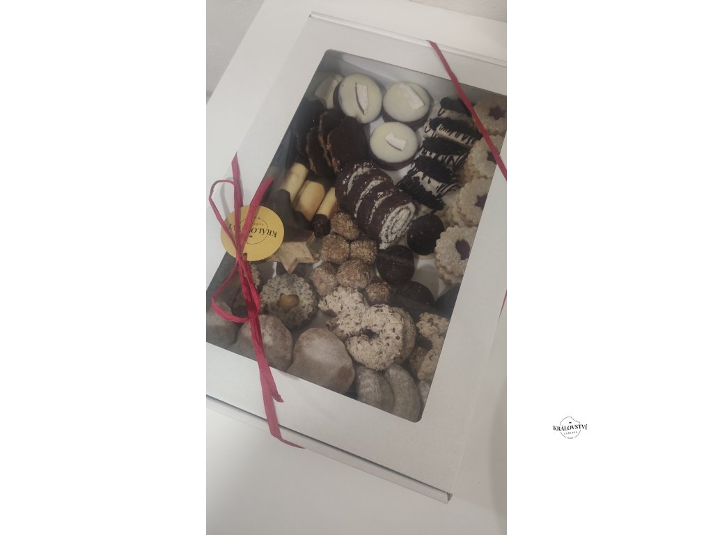 Vánoční cukroví mix 14 druhů v dárkové krabičce s průhledným víkem, včetně zdobené máslové sušenky s logem nebo jiným vybraným motivem.