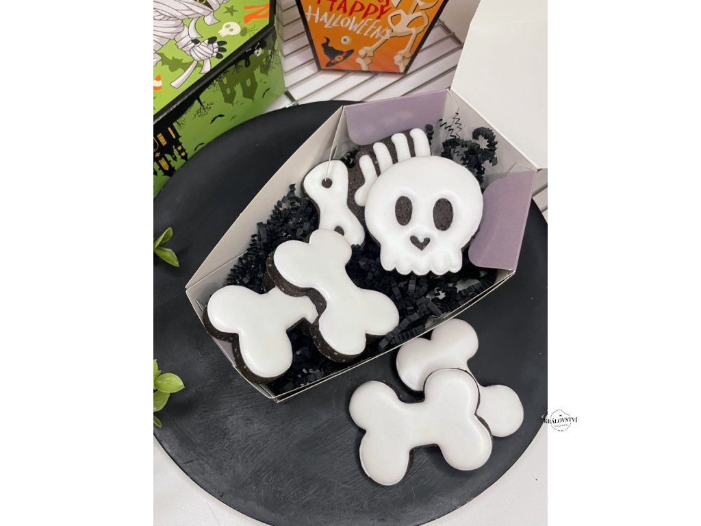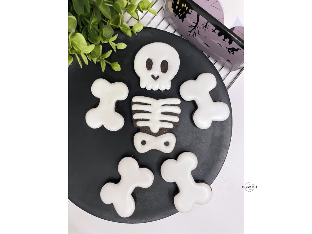 Originální sada 6 sušenek ve tvaru kostlivce v krabičce ve tvaru rakve. Obsahuje 4 kosti, lebku a trup.