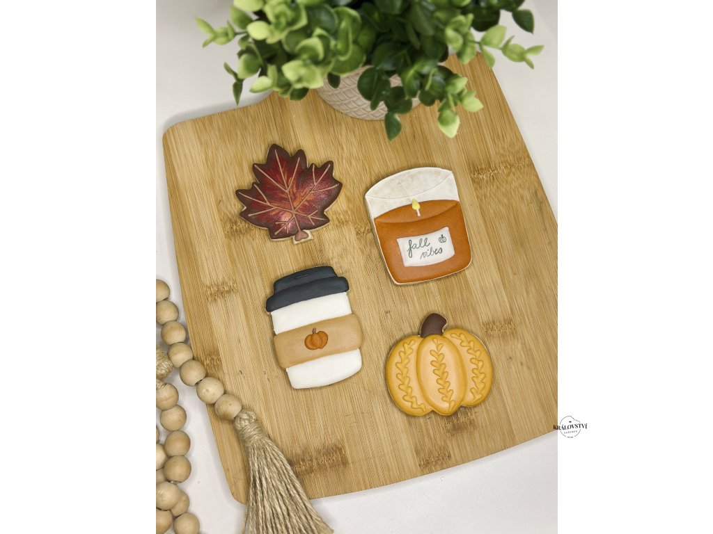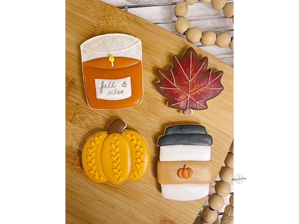 Podzimní sada 4 ks sušenek o velikosti každá 8 cm. V sadě jsou 2 různobarevné dýně s pleteným vzorem, svíčka a káva.