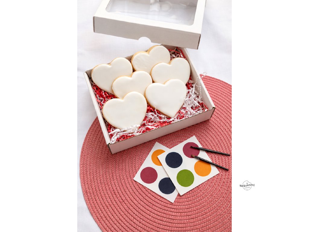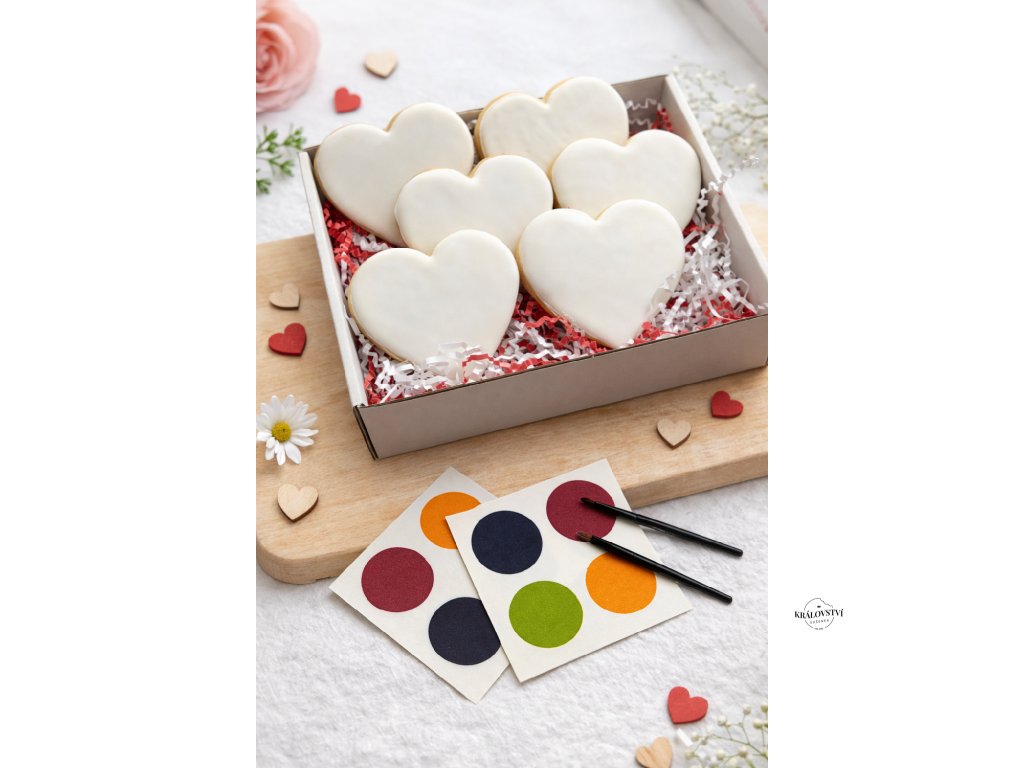 Tento valentýnský box je dokonalou kombinací sladkého dárku a kreativní zábavy. Uvnitř najdete 6 máslových sušenek s bílou polevou připravená přesně tak, aby se stala vaším vlastním malým uměleckým dílem. Součástí balení jsou barevné paletky s jedlými barvami a štětec, díky kterým si můžete sušenky sami nazdobit podle fantazie.