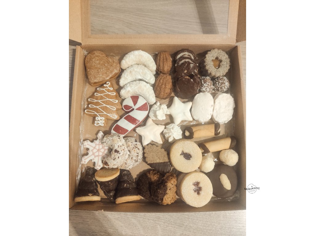 Vánoční cukroví mix 15 druhů o váze 0,5 kg (přibližně 45 -50 kusů) v dárkové krabičce s průhledným víkem.