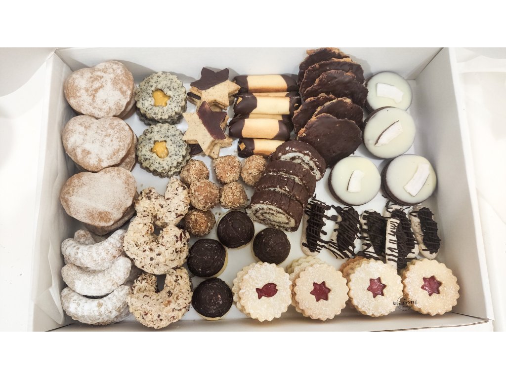 Vánoční cukroví mix 15 druhů o váze 1 kg (přibližně 90 - 100 kusů) v dárkové krabičce s průhledným víkem.