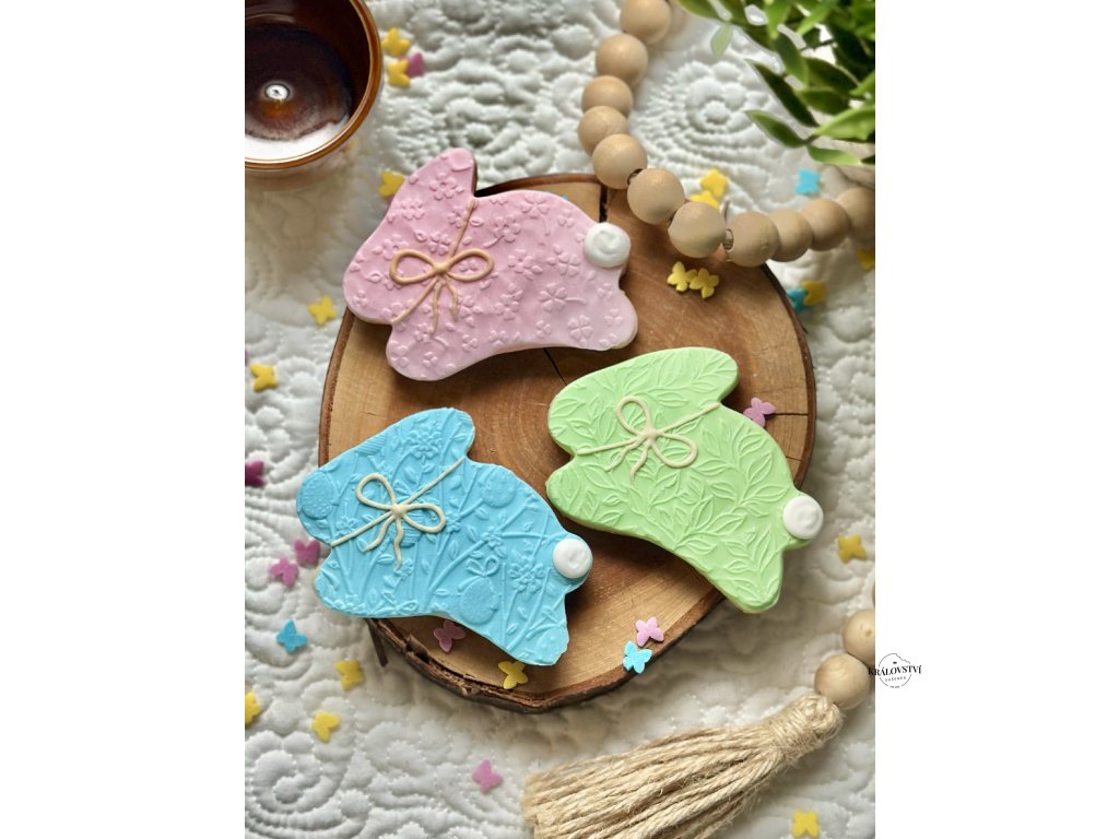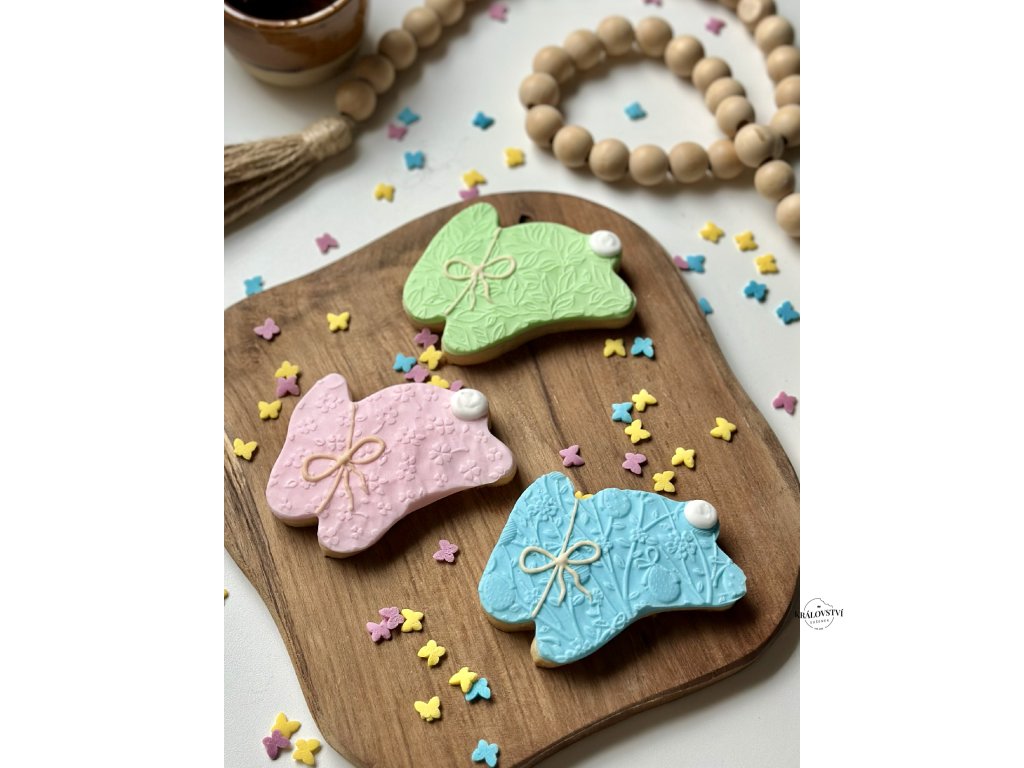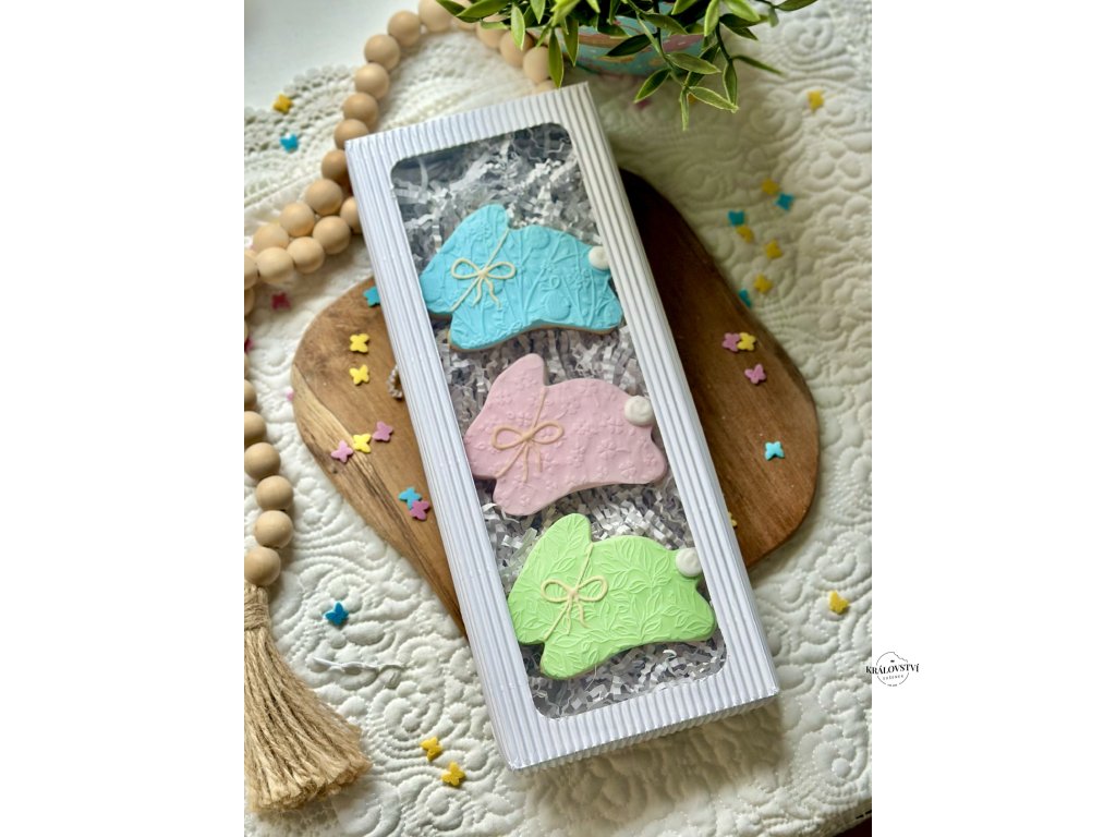 Tato elegantní sada tří sušenek ve tvaru zajíčků v jemných pastelových barvách – zelené, modré a růžové, je skvělým doplňkem pro každou příležitost.