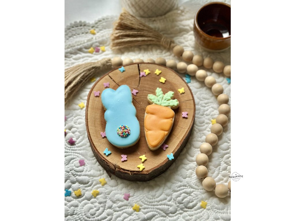 Sada obsahuje sušenku ve tvaru mrkvičky a zajíčka, který je k dispozici ve dvou barevných variantách – růžový nebo modrý. Ideální jako sladký dárek pro děti, na oslavy nebo jen tak pro radost.